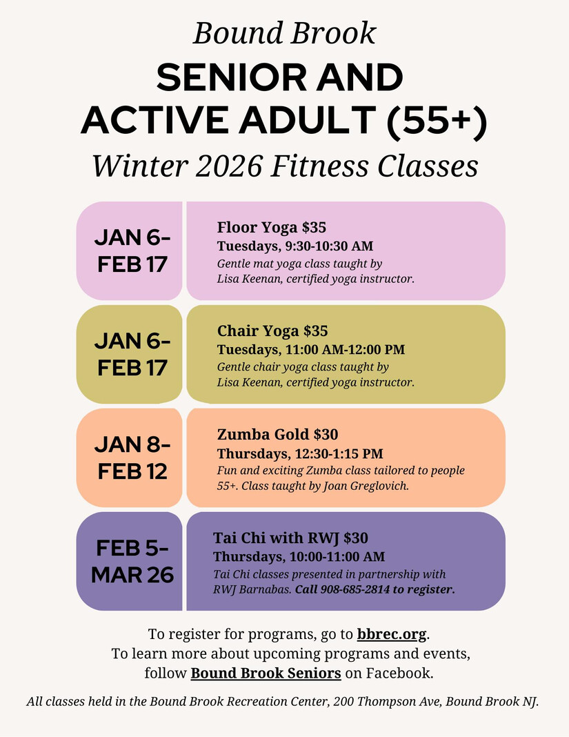 Bound Brook Senior Active Adult (55+) Winter 2026 Fitness Class Announcement