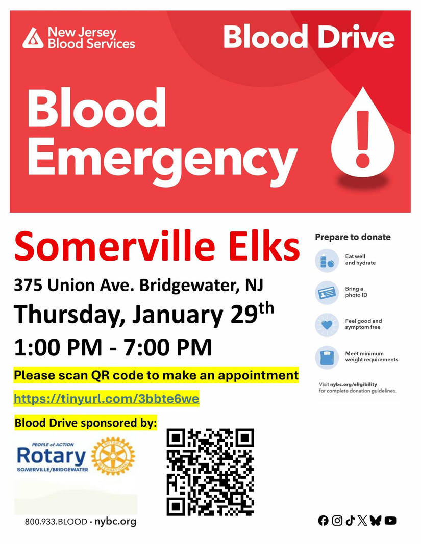 nternational Rotary Club of Somerville & Bridgewater Blood Drive on January 29th