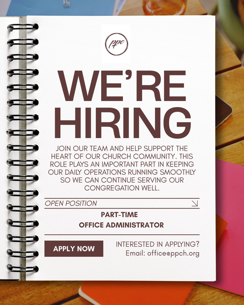 We’re Hiring: Part-Time Office AdministratorOur church is seeking a part-time Office Administrator (20–25 hours per week) to support daily office operations and help keep our ministry running smoothly.This is a great opportunity for someone who is organized, detail-oriented, and looking for meaningful part-time work in a supportive church environment.Interested candidates are invited to send their resume to office@ppch.org.Please share with anyone who may be interested!