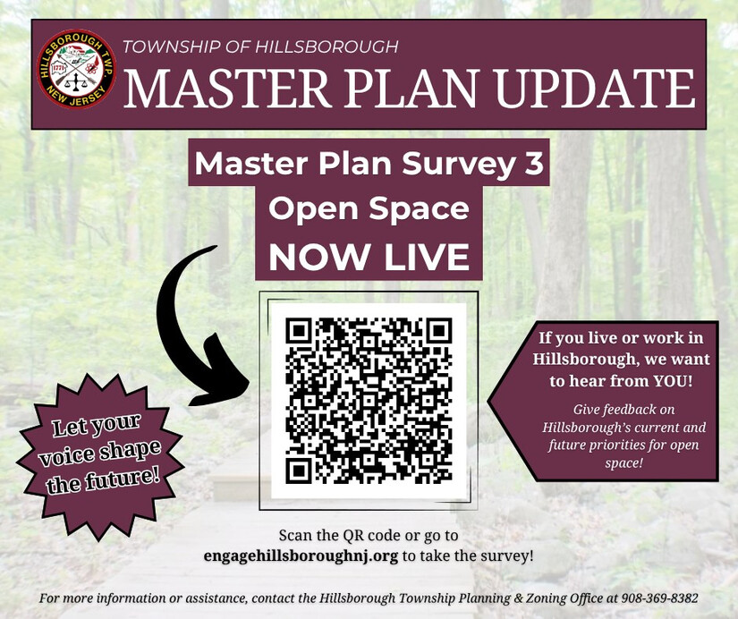 Hillsborough is in the process of updating its Master Plan. The Master Plan creates a “roadmap” for the Township to create a vibrant and thriving community, and includes elements such as transportation, land use, farmland, open space, and more. We have already released two surveys in an effort to collect feedback on the Goals of the Master Plan and the Land Use Element.Our next survey is now live! This survey focuses on Open Space, including the identification of present land (both private and public) designated as open space, the determination of land that can be designated as open space for future acquisitions, and the development of a plan to protect present and future open space. The survey is available on our Engage Hillsborough platform at www.engagehillsboroughnj.org in multiple languages. We encourage all community members to take the survey and make their voices heard! https://engagehillsboroughnj.org/p35038