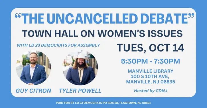 The CDNJ Women’s Caucus and LD 23 Democrats invite you to “The Uncancelled Debate” a Town Hall on Women’s Issues with State Assembly candidates Guy Citron and Tyler Powell.