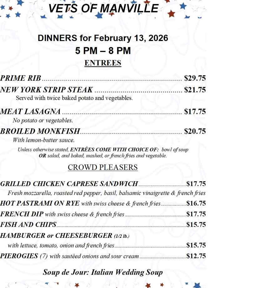 Vets of Manville - Dinners for February 13th || 5pm - 8pm