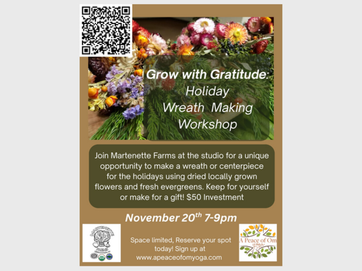 Join Martenette Farms at A Peace of Om Yoga or a unique opportunity to make a wreath or centerpiece for the holidays using dried locally grown flowers and fresh evergreens. Keep for yourself or make for a gift!