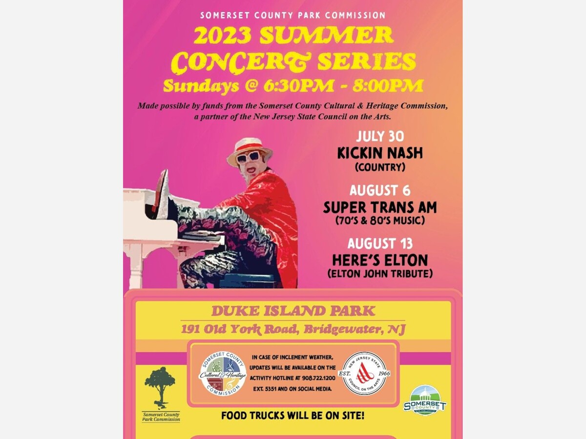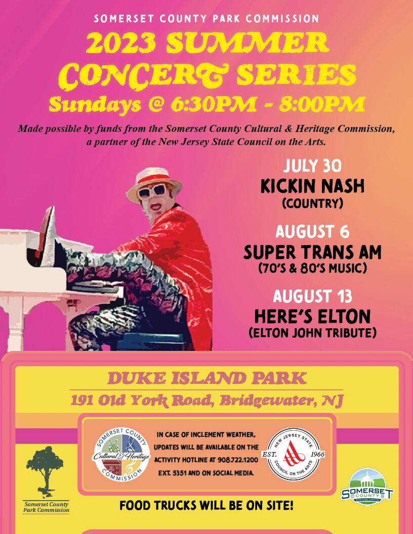 Admission is free and food trucks are available. Bring a blanket or chairs. The Summer Concert Series is made possible by funds from the Somerset County Cultural & Heritage Commission, a partner of the New Jersey State Council on the Arts.