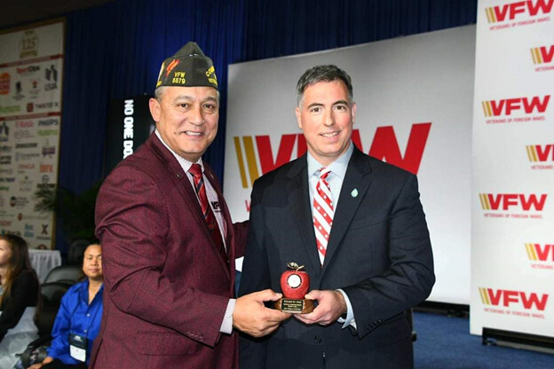 SCVTHS teacher Ed Graf (right) is the recipient of the 2024 Smart/Maher Veterans of Foreign Wars National Citizenship Education Teacher Award at the high school level. VFW National Commander Duane Sarmiento (left) presented the award to Mr. Graf at the VFW National Convention held this past summer.BRIDGEWATER – Somerset County Vocational and Technical High School (SCVTHS) history teacher Ed Graf was honored as the 2024 recipient of the Smart/Maher Veterans of Foreign Wars National Citizenship Education Teacher Award at the high school level. The award was presented during the 125th VFW Convention held in Louisville, Kentucky, this past summer.