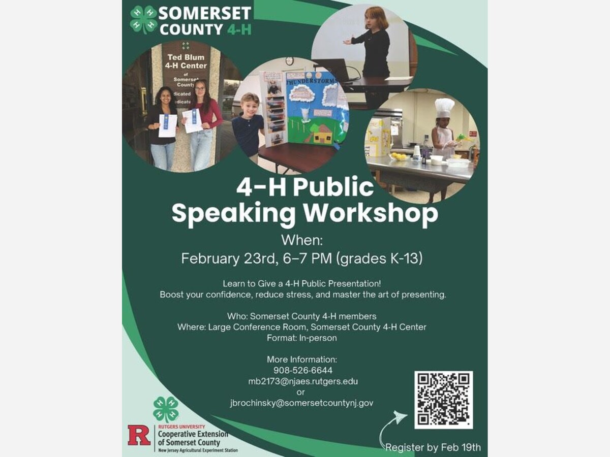 Somerset County 4‑H will host an in‑person workshop designed to help members build confidence and strengthen their public‑speaking skills. Participants will learn practical techniques to reduce stress, organize their thoughts, and deliver clear, engaging presentations.