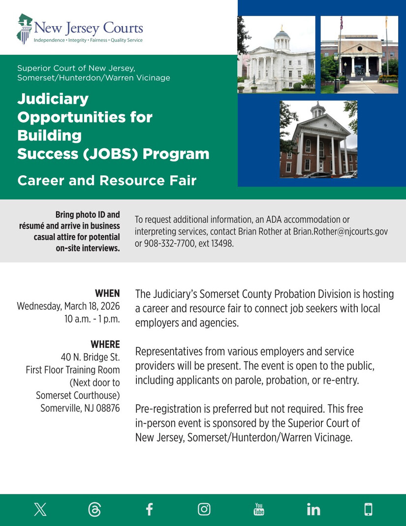 The Judiciary’s Probation Division in Somerset County will host a Judiciary Opportunities for Building Success (JOBS) Program Career and Resource Fair on Wednesday, March 18, from 10 a.m. to 1 p.m. The event will take place at 40 North Bridge St., Somerville, in the first‑floor training room next to the Somerset County Courthouse.