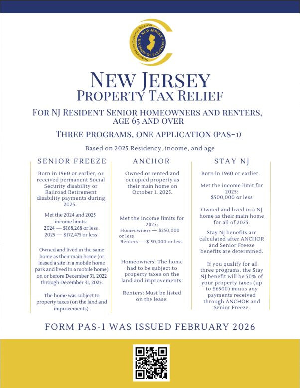 The New Jersey Division of Taxation offers property tax relief programs for homeowners and renters, aged 65 and older. To apply, complete Form PAS-1 by November 2, 2026. Applicants can call the Division of Taxation at 1-888-238-1233 for assistance or visit propertytaxrelief.nj.gov.