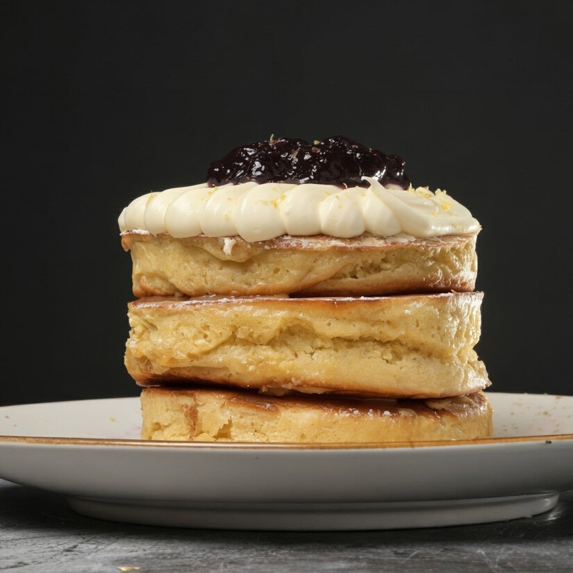 This indulgent stack begins with three fluffy buttermilk pancakes, each one soft, warm, and perfectly golden. The pancakes are then crowned with a creamy lemon ricotta topping, giving every forkful a velvety richness. Finally, a generous spoonful of blueberry compote brings bright, fruity depth to the plate.