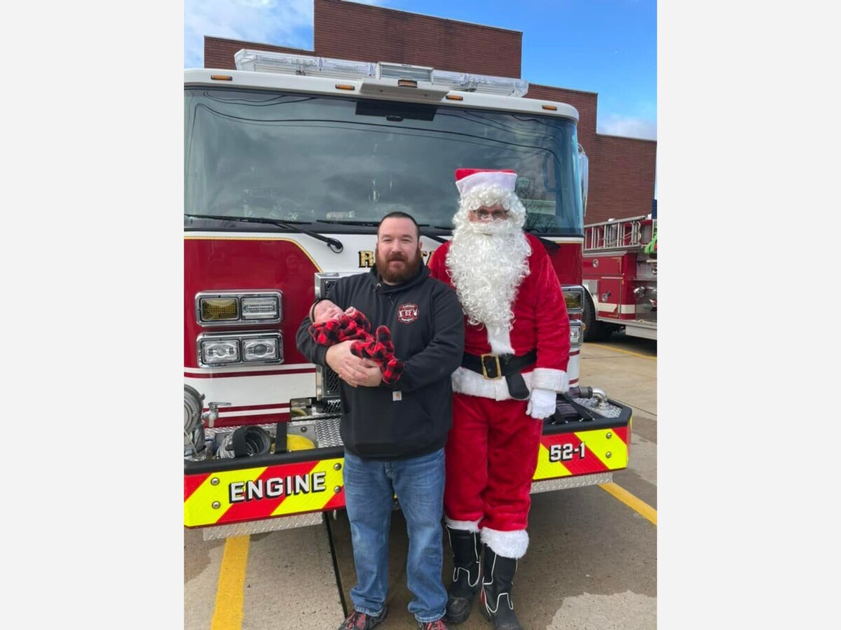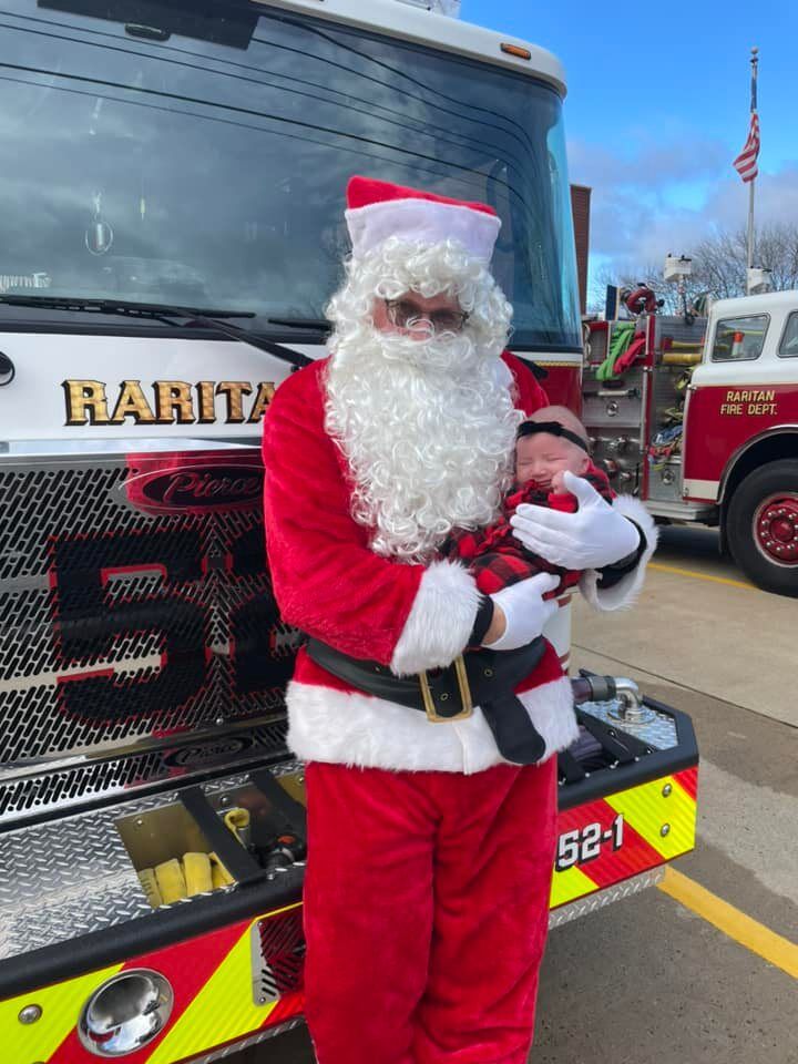 Last Sunday the members of the Raritan Fire Department conducted our annual Candy Cane Run which was yet again a great success. Before leaving the firehouse the crew got to meet Firefighter Gabe DiNella and his wife Monica’s newborn baby girl Gianna Rose DiNella for the first time. Gianna entered this crazy world on November 2nd weighing 7 pounds 1 ounce. The proud father posed for a quick picture with Gianna and Santa in front of the Engine 52-1. The Fire Department has been such a big part of Gabe’s life since high school when he joined so this picture combines his love for his daughter and his love for the department at a magical time of year. Congratulations Monica and Gabe and the DiNella family on their new addition.