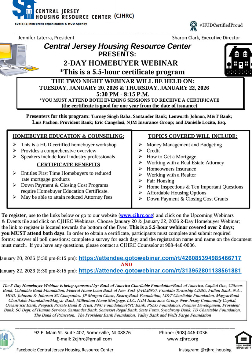 Central NJ Housing Resource Center - 2 Day Homebuyer Webinar in January 2026 -