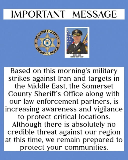 Message from Somerset County Sherriff's Office Today about Iran Strikes