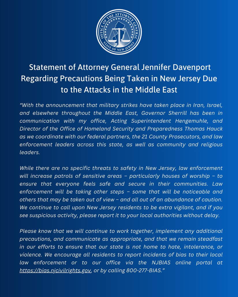 Statement of Attorney General Jennifer Davenport Regarding Precautions Being Taken in New Jersey Due to the Attacks in the Middle East
