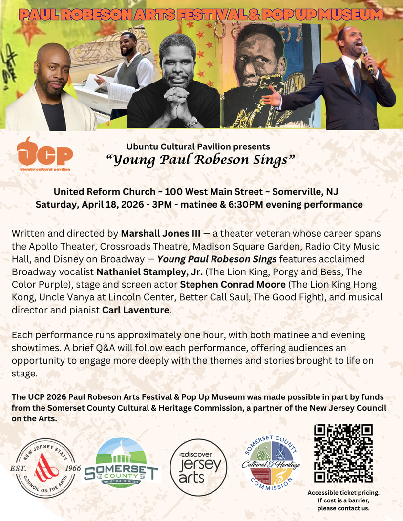 Saturday, April 18: Back by popular demand, the beloved "Young Paul Robeson Sings" takes the stage once more — with a deeper, richer story that builds to a powerful, unforgettable finale you won't want to miss. Written and directed by theater veteran, Marshall Jones III, Young Paul Robeson Sings features acclaimed Broadway vocalist Nathaniel Stampley, Jr., stage and screen actor Stephen Conrad Moore, and musical director and pianist Carl Laventure. Each performance runs approximately one hour, with both matinee and evening showtimes. A brief Q&A will follow each performance, offering audiences an opportunity to engage more deeply with the themes and stories brought to life on stage. United Reform Church, 100 W. Main Street, Somerville, NJ 3PM Matinee + 6:30PM Evening performance